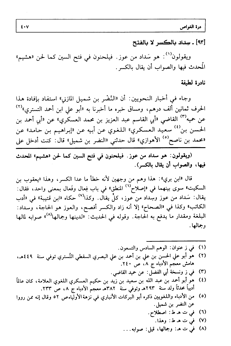 (ويقولون: هو سداد من عوز: فيلحنون في فتح السين كما لحن (هشيم) المحدث فيها والصواب أن يقال بالكسر)