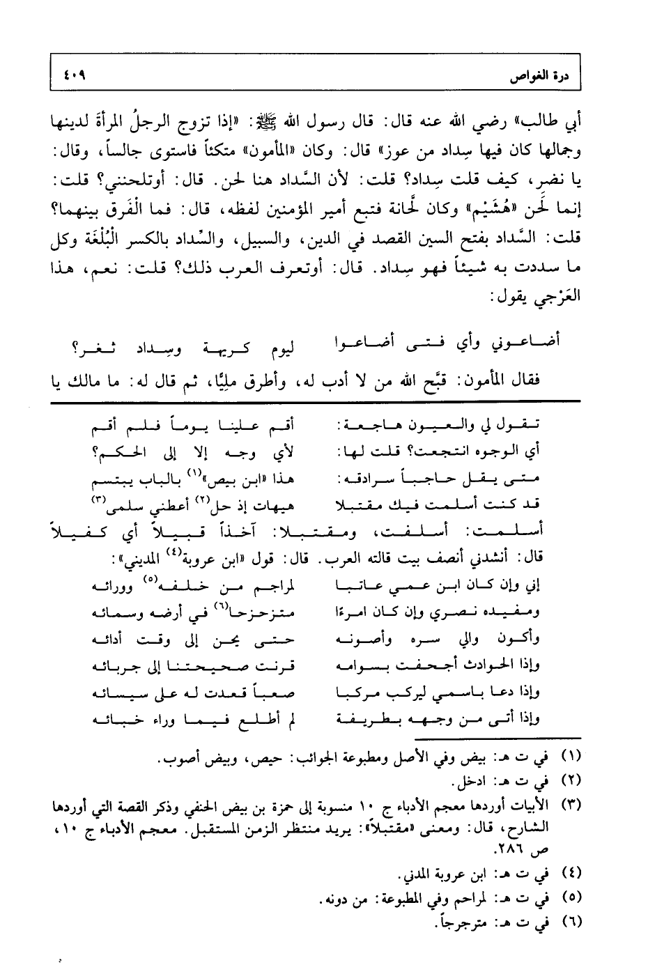 أبي طالب) رضي الله عنه قال: قال رسول الله صلى الله عليه وسلم: "إذا تزوج الرجل المرأة لدينها وجمالها كان فيها سداد من عوز" قال: وكان (المأمون) متكئاً فاستوى جالساً، وقال: يا نضر، كيف قلت سداد؟ قلت: لأن السداد هنا لحن. قال: أو تلحنني؟ قلت: إنما لحن (هشيم) وكان لحانة فتبع أمير المؤمنين لفظه، قال: فما الفرق بينهما؟ قلت: السداد بفتح السين القصد في الدين، والسبيل، والسداد بالكسر البلغة وكل ما سددت به شيئاً فهو سداد. قال: أو تعرف العرب ذلك؟ قلت: نعم، هذا العرجي يقول: