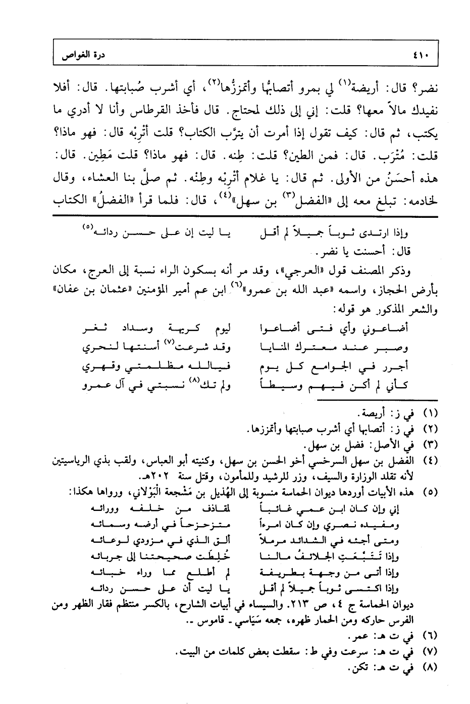 نضر؟ قال: أريضة لي بمرو أتصابها وأتمززها، أى أشرب صبابتها. قال: افلا نفيدك مالاً معها؟ قلت: إنى إلي ذلك لمحتاج. قال فأخذ القرطاس وأنا لا أدري ما يكتب، ثم قال: كيف تقول إذا أمرت أن يترب الكتاب؟ قلت أتربه قال: فهو ماذا؟ قلت: مترب. قال: فمن الطين؟ قلت: طنه. قال: فهو ماذا؟ قلت: مطين. قال: هذه أحسن من الأولي. ثم قال: يا غلام أتربه وطنه. ثم صلى بنا العشاء، وقال لخادمه: تبلغ معه إلى (الفضل بن سهل)، قال: فلما قرأ (الفضل) الكتاب