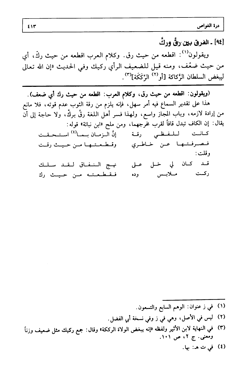 ويقولون: اقطعه من حيث رق. وكلام العرب اقطعه من حيث رك، أي من حيث ضعف، ومنه قيل للضعيف الرأي ركيك وفي الحديث «إن الله تعالى ليبغض السلطان الركاكة [أو الرككة].