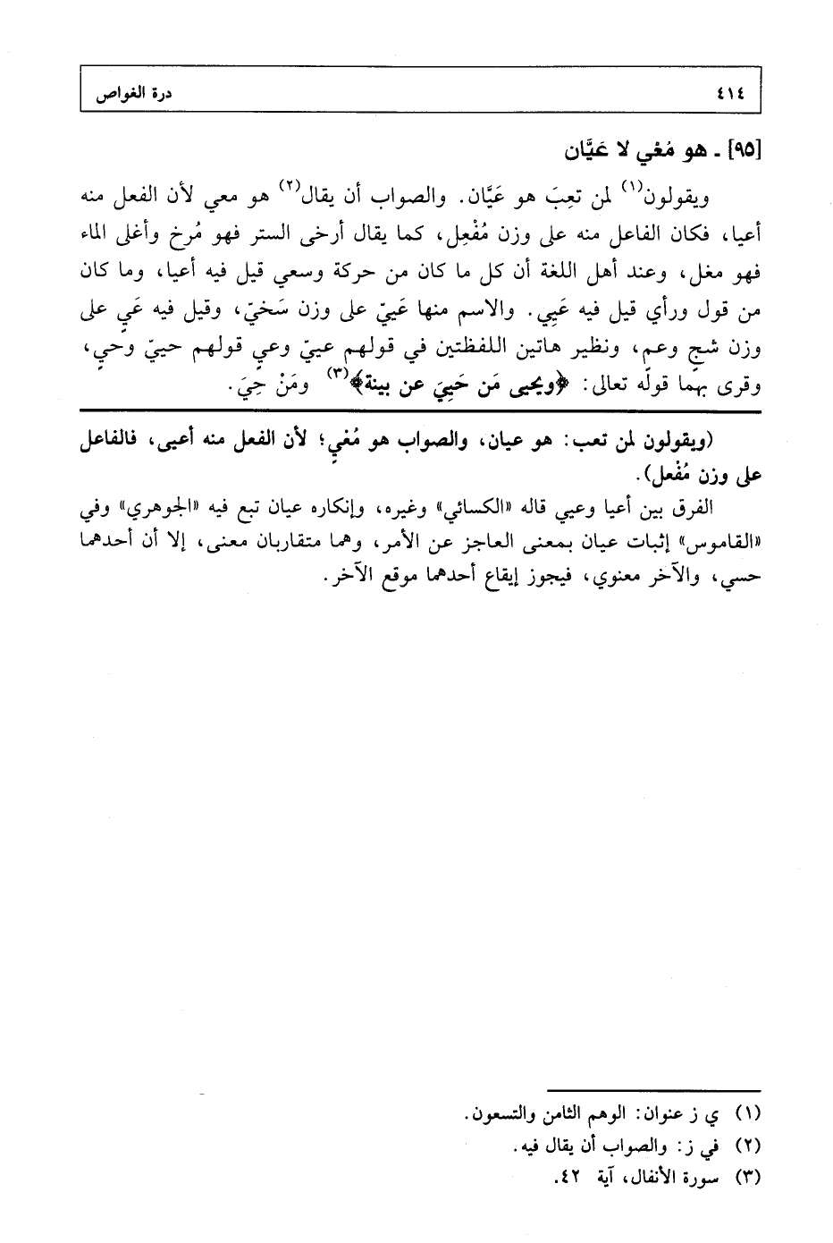(ويقولون لمن تعب: هو عيان، والصواب هو معي؛ لأن الفعل منه أعيي، فالفاعل على وزن مفعل).