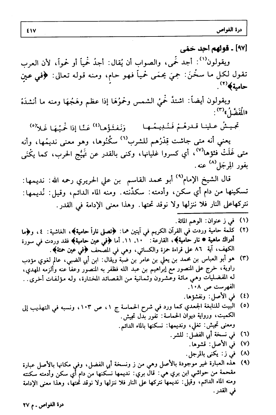 ويقولون: أجد حمى، والصواب أن يقال: أجد حمياً أو حموا، لأن العرب تقول لكل ما سخن: حمي يحمي حمياً فهو حام، ومنه قوله تعالى: {في عين حامية}.