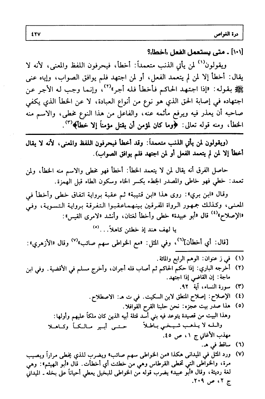 (ويقولون لمن يأتي الذنب معتمداً: وقد أخطأ فيحرقون اللفظ والمعنى، لأنه لا يقال أخطأ إلا لمن لم يتعمد الفعل أو لمن اجتهد فلم يوافق الصواب).