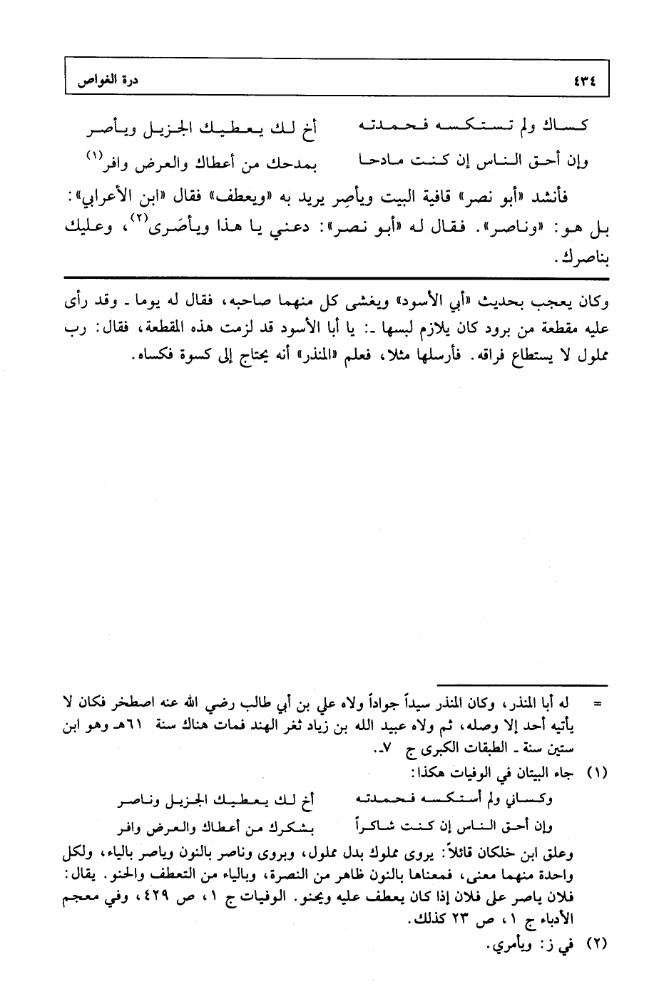 فأنشد «أبو نصر» قافية البيت ويأصر يريد به «ويعطف» فقال «ابن الأعرابي»: بل هو: «وناصر». فقال له «أبو نصر»: دعني يا هذا ويأصري، وعليك بناصرك.