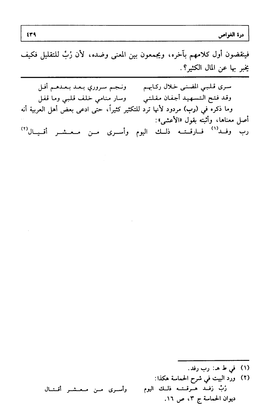 وما ذكره في (رب) مردود لأنها ترد للتكثير كثيراً، حتى ادعى بعض أهل العربية أنه أصل معناها، وأبته بقول «الأعشى»: