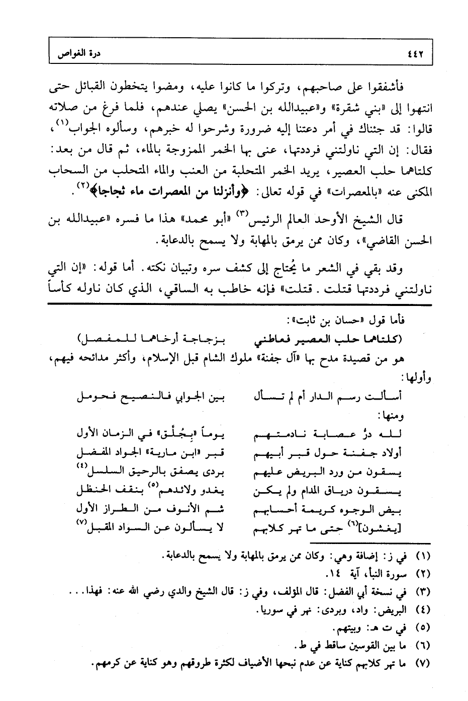 فأشفقوا على صاحبهم، وتركوا ما كانوا عليه، ومضوا يتخطون القبائل حتى انتهوا إلى «بني شفرة» و «عبيد الله بن الحسن» يصلي عندهم، فلما فرغ من صلاته قالوا: قد جئناك في أمر دعتنا إليه ضرورة وشرحوا له خبرهم، وسألوه الجواب، فقال: إن التي ناولتني فرددتها، عنى بها الخمر الممزوجة بالماء، ثم قال من بعد: كلتاهما حلب العصير، يريد الخمر المتحلبة من العنب والماء المتحلب من السحاب المكنى عنه «بالمعصرات» في قوله تعالى: {وأنزلنا من المعصرات ماء ثجاجا}.