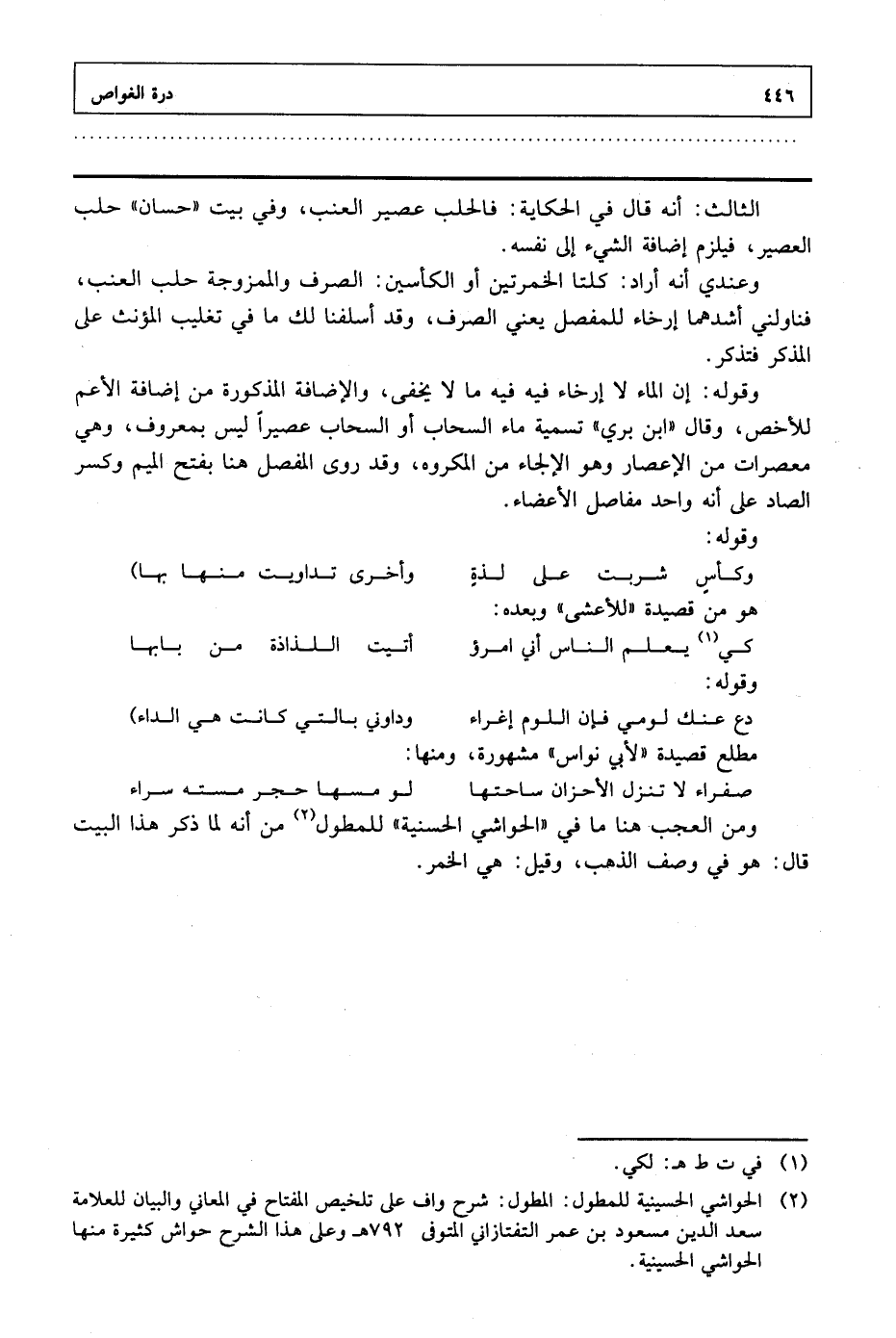 ومن العجب هنا ما في «الحواشي الحسنية» للمطول من أنه لما ذكر هذا البيت قال: هو في وصف الذهب، وقيل: هي الخمر.