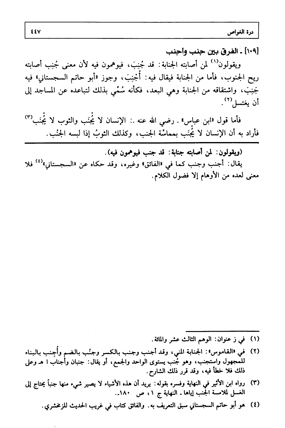 ويقولون لمن أصابته الجنابة: قد جنب، فيوهمون فيه لأن معنى جنب أصابته ريح الجنوب، فأما من الجنابة فيقال فيه: أجنب، وجوز «أبو حاتم السجستاني» فيه جنب، واشتقاقه من الجنابة وهي البعد، فكأنه سمي بذلك لتباعده عن المساجد إلى أن يغتسل.