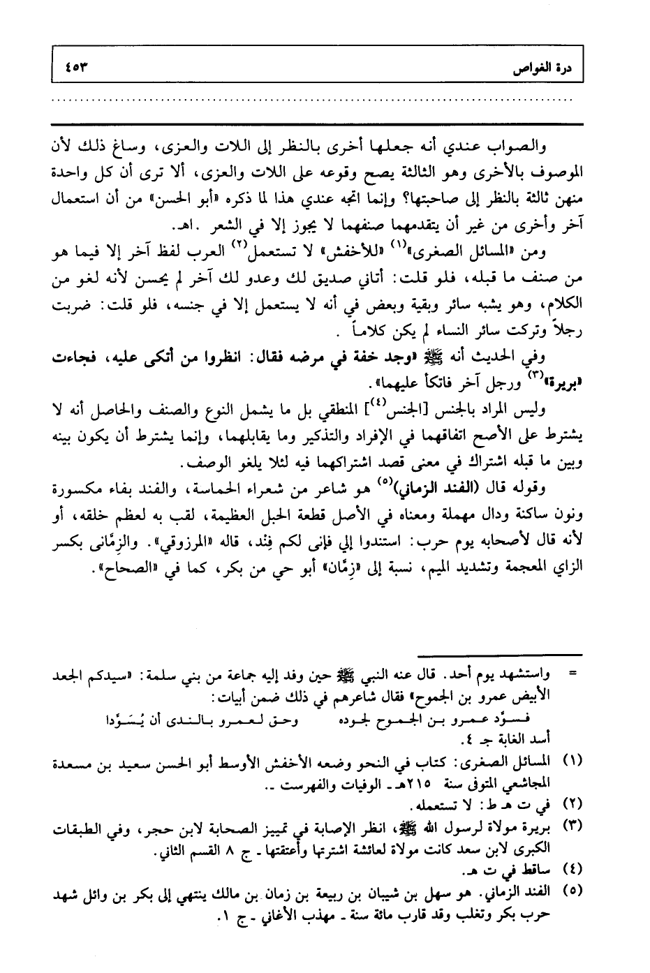 والصواب عندي أنه جعلها أخرى بالنظر إلى اللات والعزى، وساغ ذلك لأن الموصوف بالأخرى وهو الثالثة يصح وقوعه على اللات والعزى، ألا ترى أن كل واحدة منهن ثالثة بالنظر إلى صاحبتها؟ وإنما اتجه عندي هذا لما ذكره «أبو الحسن» من أن استعمال آخر وأخرى من غير أن يتقدمهما صنفهما لا يجوز إلا في الشعر. اهـ.