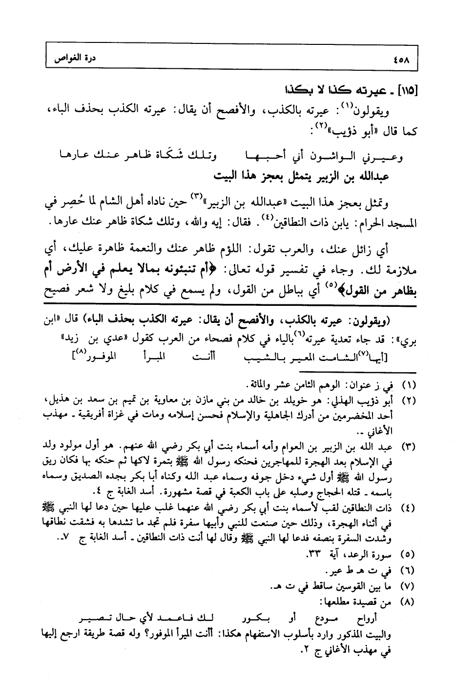 (ويقولون: عيرته بالكذب، والأفصح أن يقال: عيرته الكذب بحذف الباء) قال «ابن بري»: قد جاء تعدية عيرته بالياء في كلام فصحاء من العرب كقول «عدي بن زيد»