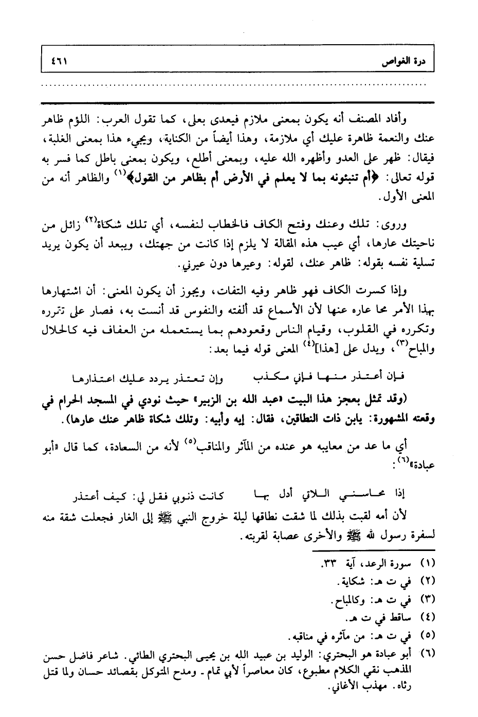(وقد تمثل بعجز هذا البيت «عبد الله بن الزبير» حيث نودي في المسجد الحرام في وقعته المشهورة: يابن ذات النطاقين، فقال: إيه وأبيه: وتلك شكاة ظاهر عنك عارها).