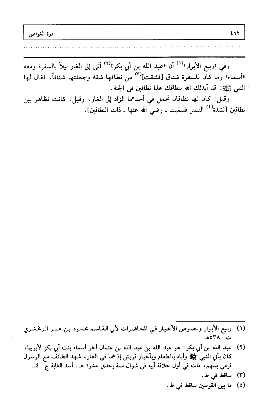 وفي «ربيع الأبرار» أن «عبد الله بن أبي بكر» أتى إلى الغار ليلاً بالسفرة ومعه «أسماء» وما كان للسفرة شناق [فشقت] من نطاقها شقة وجعلتها شناقاً، فقال لها النبي صلى الله عليه وسلم: قد أبدلك الله بنطاقك هذا نطاقين في الجنة.
