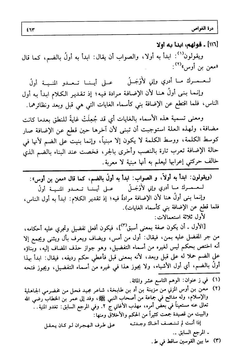 (ويقولون: ابدأ به أولاُ، والصواب: ابدأ به أول بالضم، كما قال «معن بن أوس»: