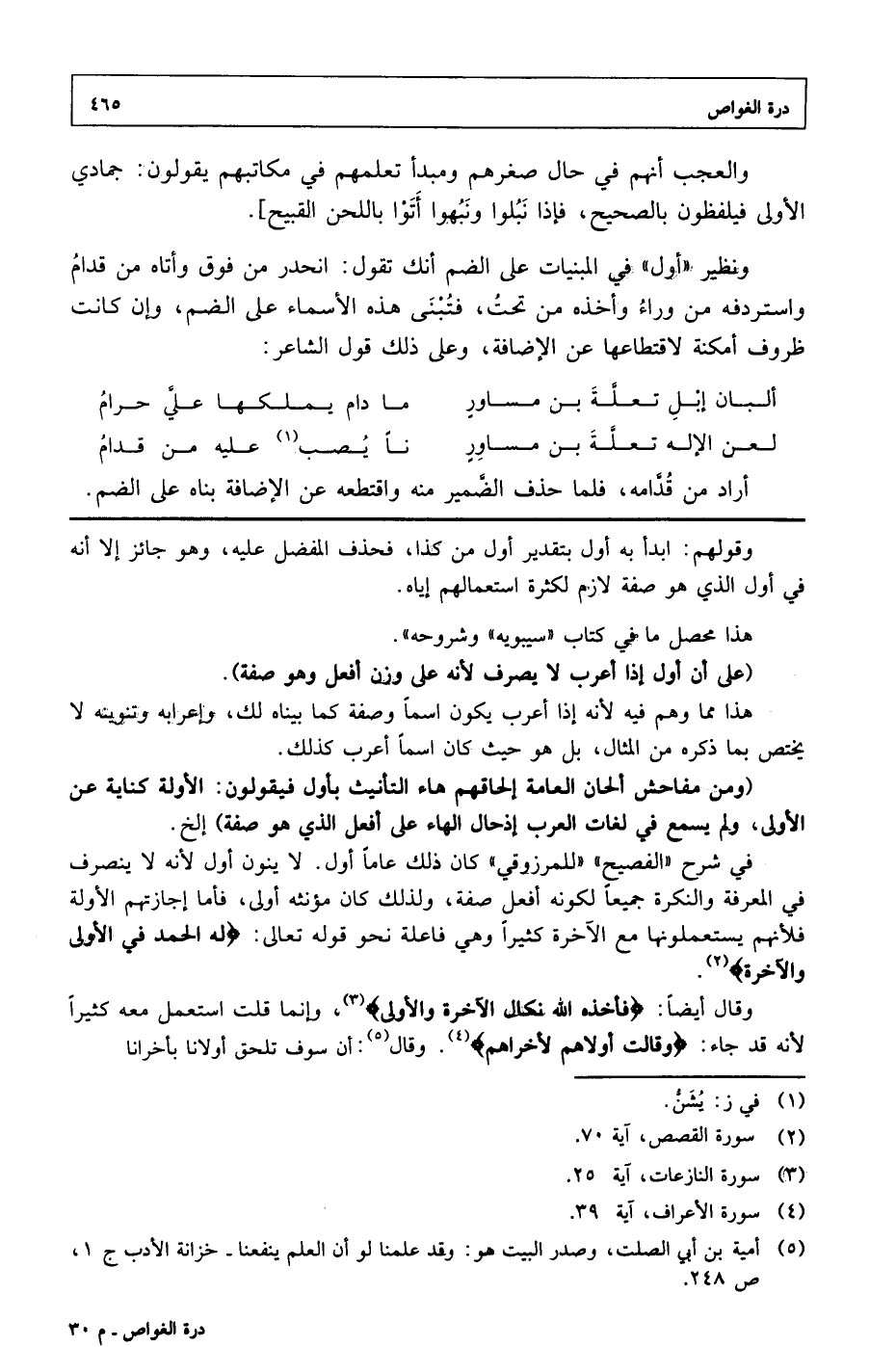 (ومن مفاحش ألحان العامة إلحاقهم هاء التأنيث بأول فيقولون: الأولة كتابة عن الأولى، ولم يسمع في لغات العرب إذحال الهاء على أفعل الذي هو صفة) إلخ.