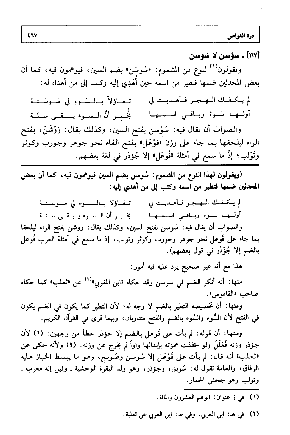 ويقولون لنوع من المشموم: «سوسن» بضم السين، فيوهمون فيه، كما أن بعض المحدثين ضمها فتطير من اسمه حين أهدي إليه وكتب إلى من أهداه له: