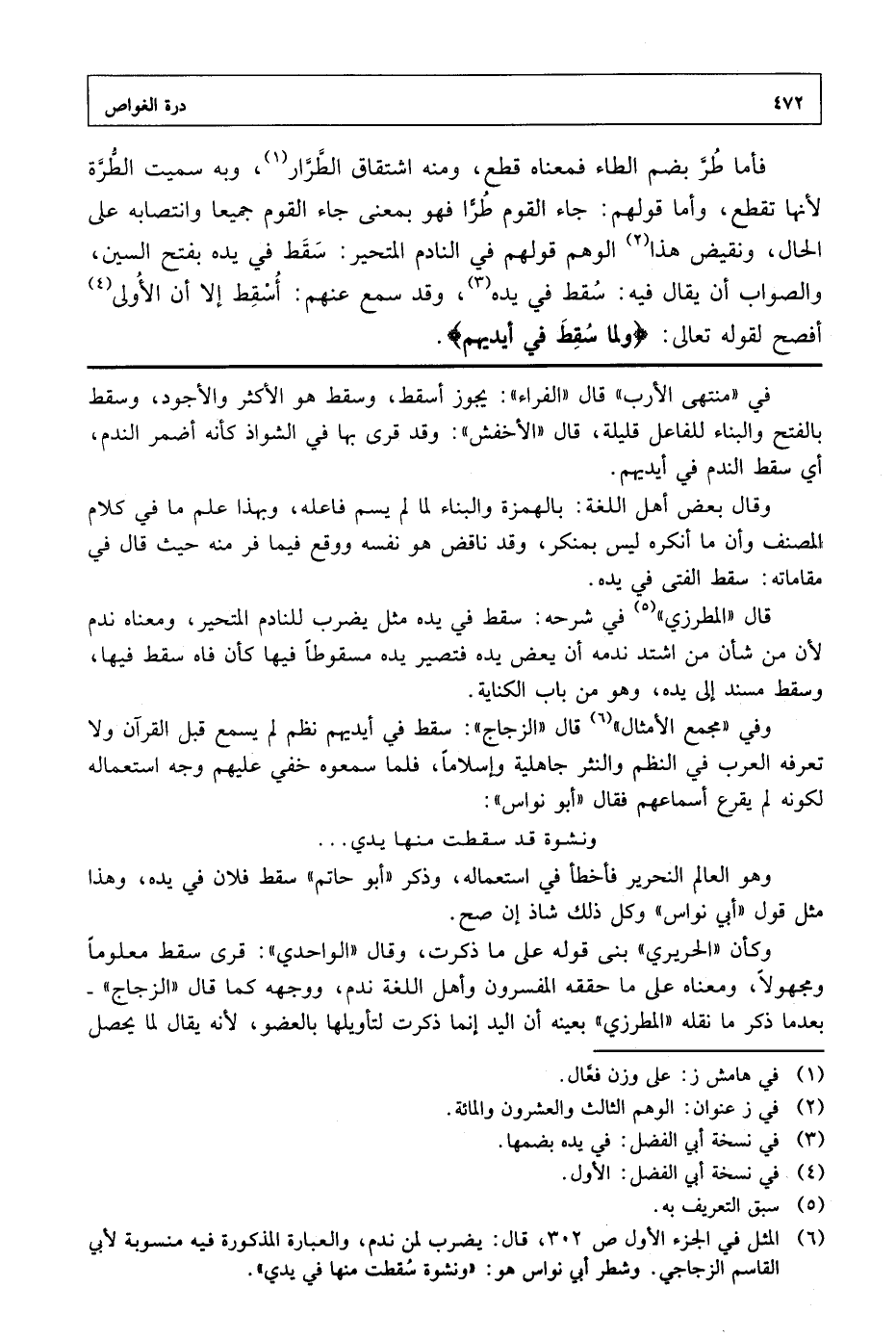 فأما طر بضم الطاء فمعناه قطع، ومنه اشتقاق الطرار، وبه سميت الطرة لأنها تقطع، وأما قولهم: جاء القوم طرا فهو بمعنى جاء القوم جميعا وانتصابه على الحال، ونقيض هذا الوهم قولهم في النادم المتحير: سقط في يده بفتح السين، والصواب أن يقال فيه: سقط في يده، وقد سمع عنهم: أسقط إلا أن الأولى أفصح لقوله تعالى: {ولما سقط في أيديهم}.
