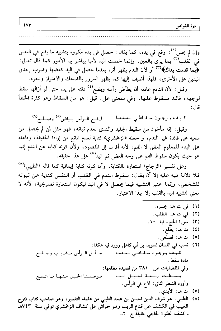 وعلى تفسير «الزجاج» استعارة بالكناية، وأما كونه كناية إيمائية كما قاله «الطيبي» فلا دلالة فيه عليه إلا أن يقال: سقوط الندم في القلب أو النفس كناية عن ثبوته للشخص، وإنما اعتبر التشبيه فيما يحصل لا في اليد ليكون استعارة تصريحية، لأنه لا معنى لتشبيه اليد بالقلب إلا بهذا الاعتبار.