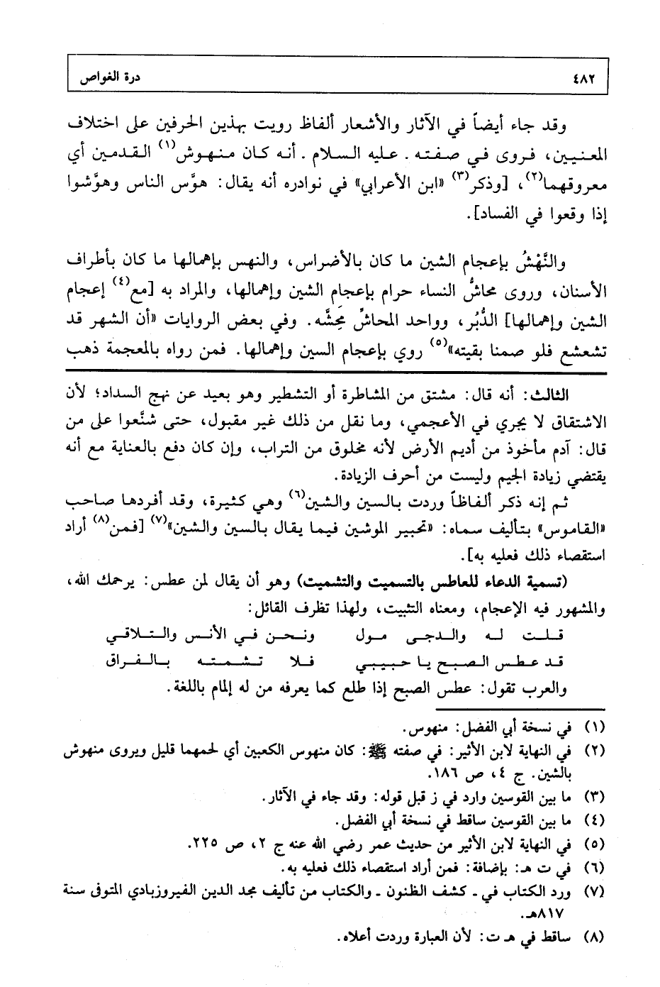 والنهش بإعجام الشين ما كان بالأضراس، والنهس بإهمالها ما كان بأطراف الأسنان، وروى محاش النساء حرام بإعجام الشين وإهمالها، والمراد به [مع إعجام الشين وإهمالها] الدبر، وواحد المحاش محشه. وفي بعض الروايات "أن الشهر قد تشعشع فلو صمنا بقيته" روي بإعجام السين وإهمالها. فمن رواه بالمعجمة ذهب