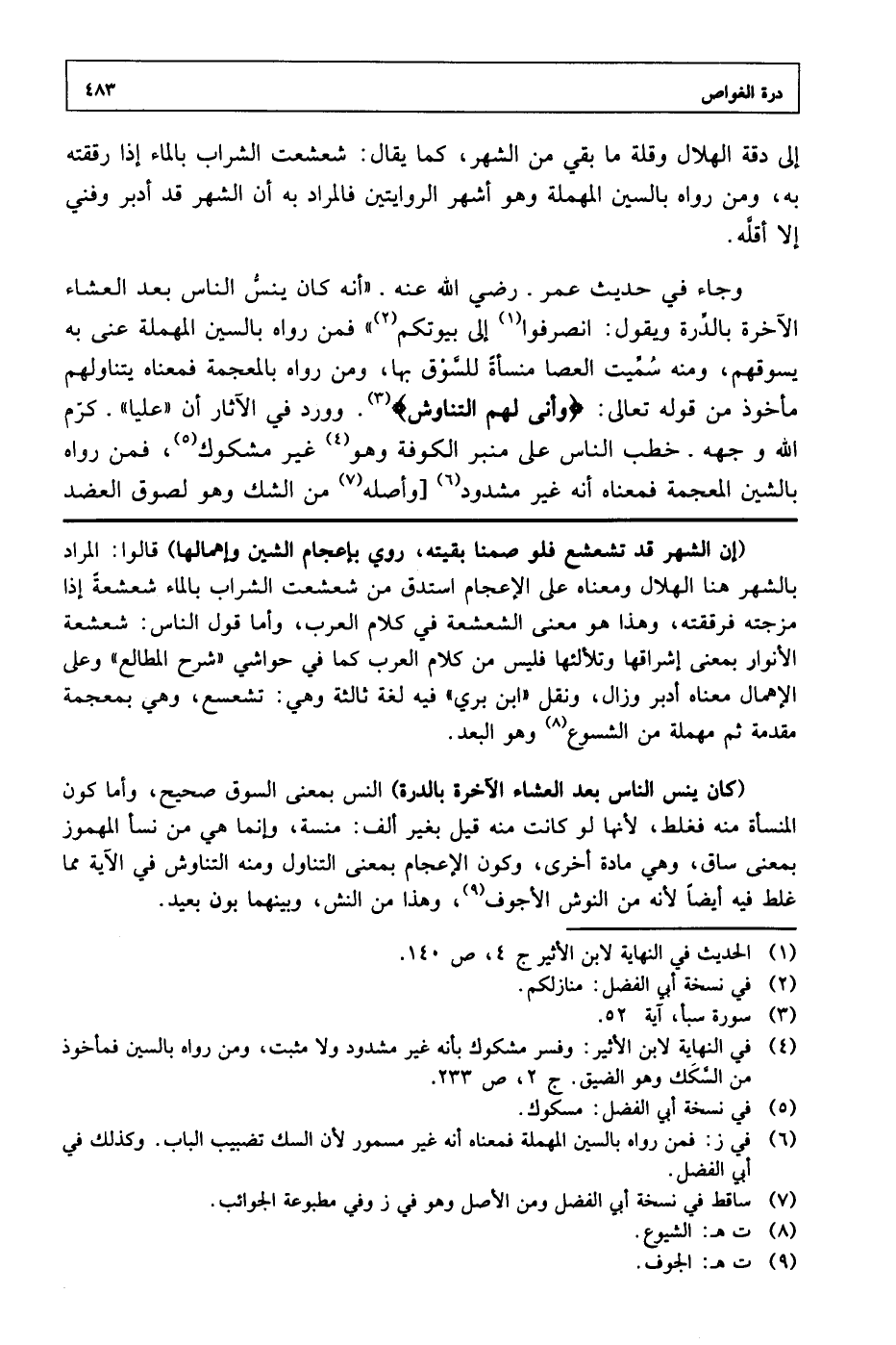 (كان ينس الناس بعد العشاء الآخرة بالدرة) النس بمعنى السوق صحيح، وأما كون المنسأة منه فغلط، لأنها لو كانت منه قيل بغير ألف: منسة، وإنما هي من نسأ المهموز بمعنى ساق، وهي مادة أخرى، وكون الإعجام بمعنى التناول ومنه التناوش في الآية مما غلط فيه أيضًا لأنه من النوش الأجوف، وهذا من النش، وبينهما بون بعيد.