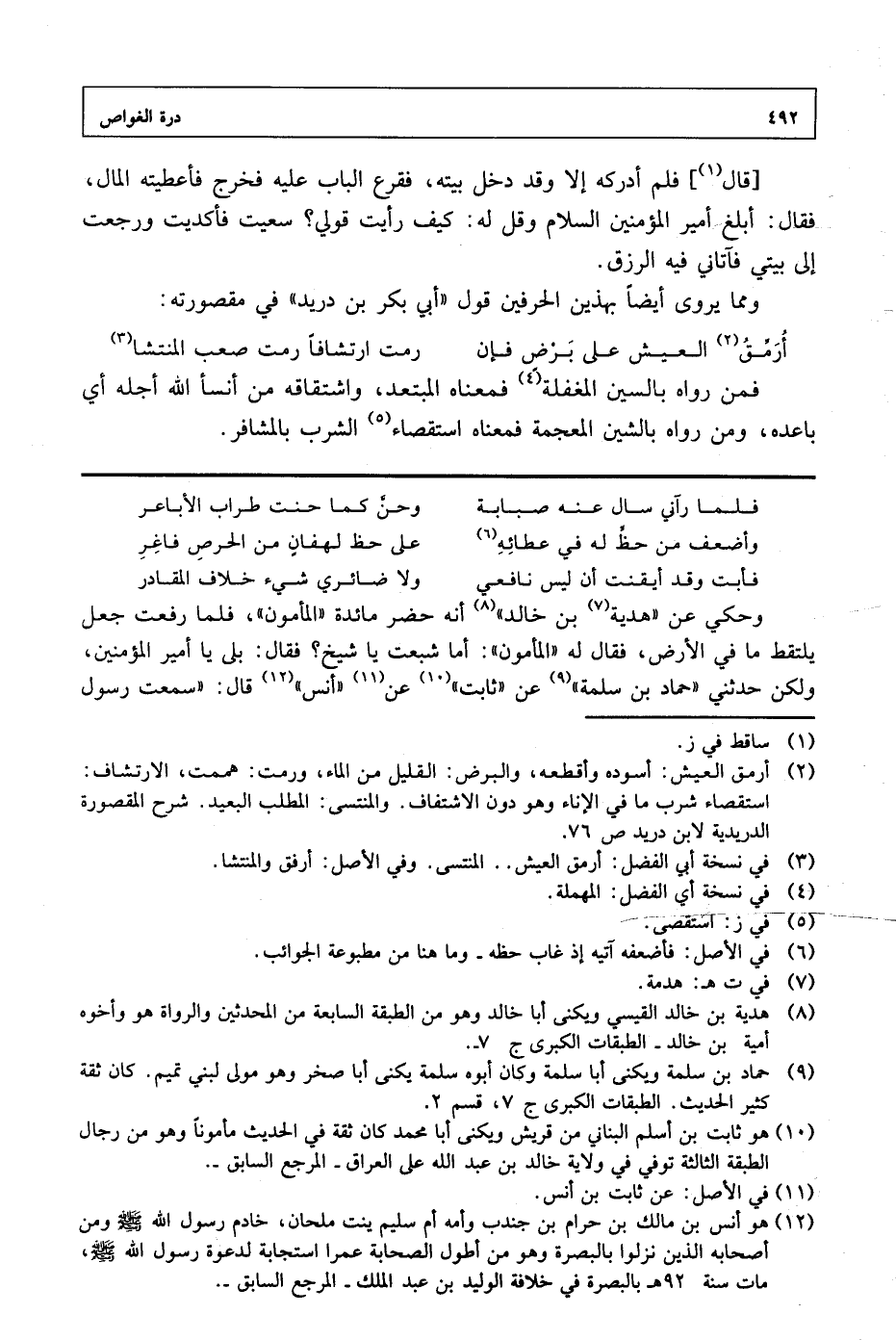 وحكي عن "هدية بن خالد" أنه حضر مائدة "المأمون"، فلما رفعت جعل يلتقط ما في الأرض، فقال له "المأمون": أما شبعت يا شيخ؟ فقال: بلى يا أمير المؤمنين، ولكن حدثني "حماد بن سلمة" عن "ثابت" عن "أنس" قال: "سمعت رسول