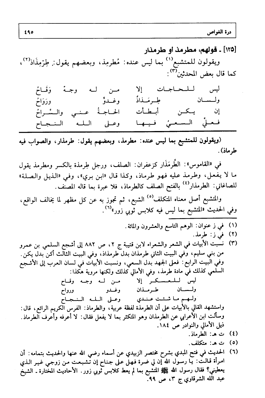 ويقولون للمتشبع بما ليس عنده: مطرمذ، وبعضهم يقول: طرمذاذ، كما قال بعض المحدثين: