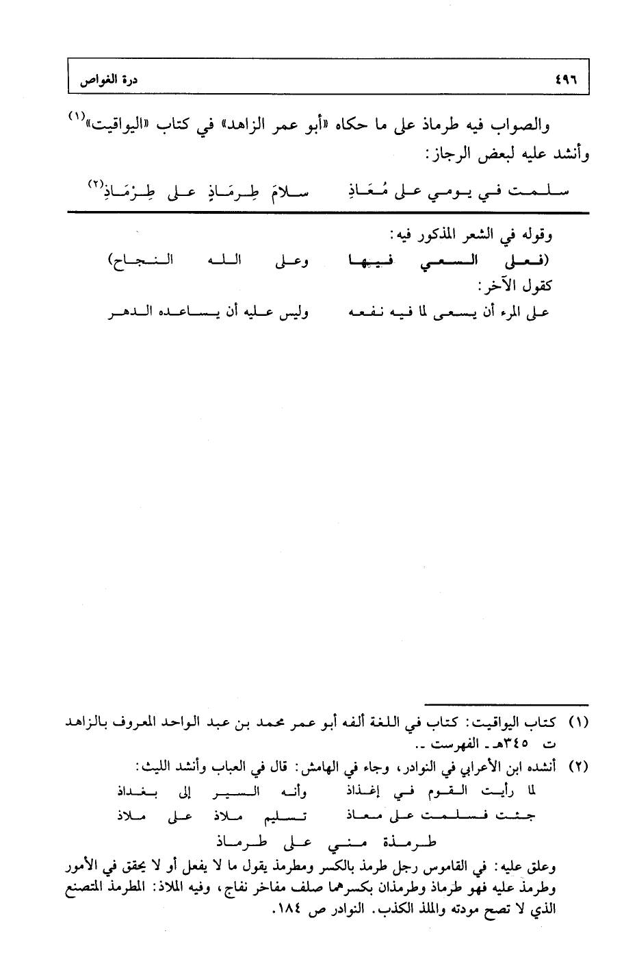 والصواب فيه طرماذ على ما حكاه "أبو عمر الزاهد" في كتاب "اليواقيت" وأنشد عليه لبعض الرجاز: