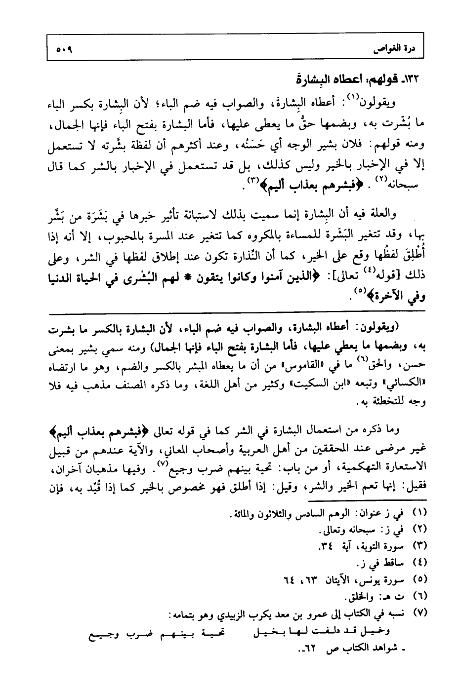 ويقولون: أعطاه البشارة، والصواب فيه ضم الباء؛ لأن البشارة بكسر الباء ما بشرت به، وبضمها حق ما يعطي عليها، فأما البشارة بفتح الباء فإنها الجمال، ومنه قولهم: فلان بشير الوجه أي حسنة، وعند أكثرهم أن لفظة بشرته لا تستعمل إلا في الإخبار بالخير وليس كذلك، بل قد تستعمل في الإخبار بالشر كما قال سبحانه. {فبشرهم بعذاب أليم}.