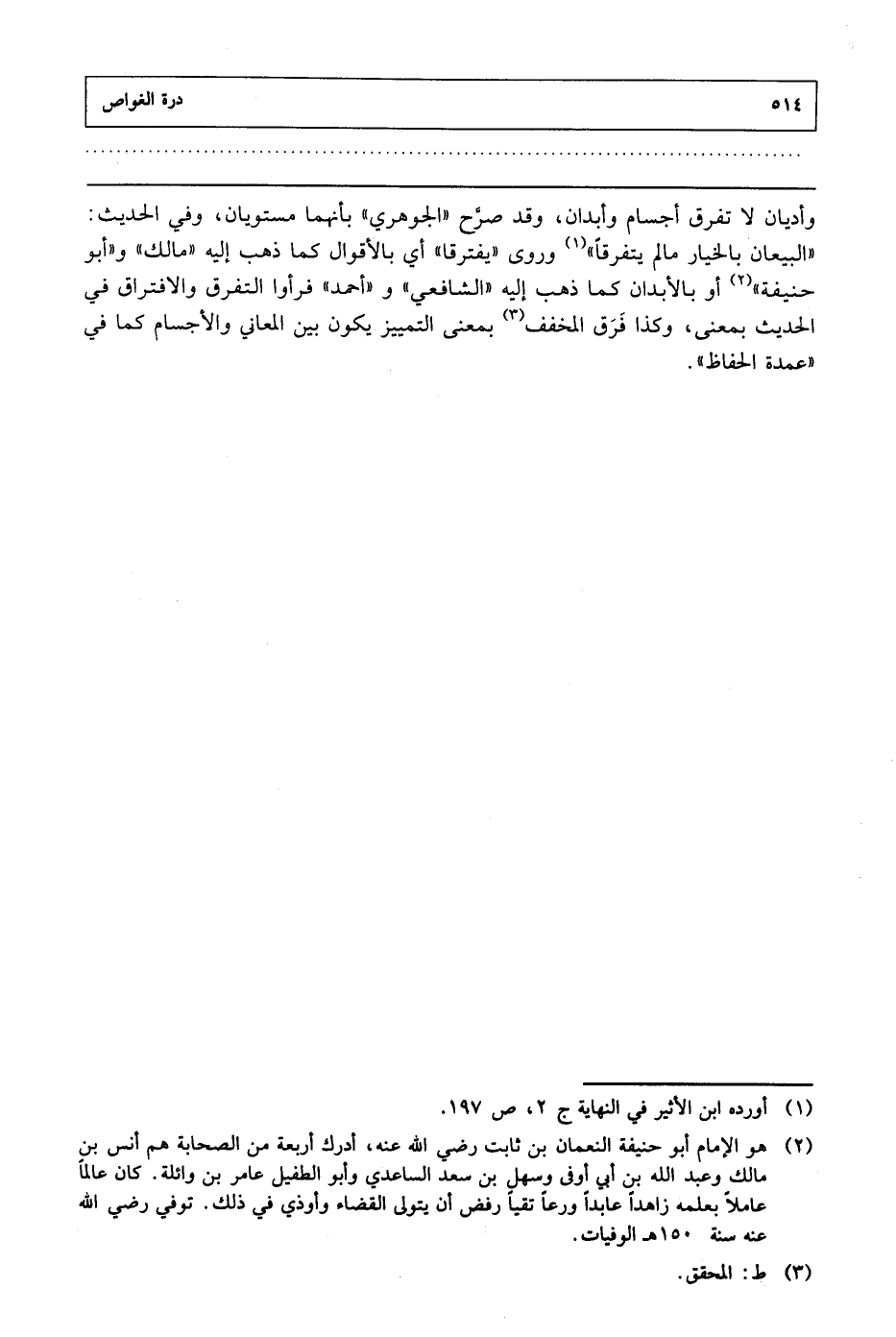وأديان لا تفرق أجسام وأبدان، وقد صرح "الجوهري" بأنهما مستويان، وفي الحديث: "البيعان بالخيار مالم يتفرقا" وروى "يفترقا" أي بالأقوال كما ذهب إليه "مالك" و"أبو حنيفة" أو بالأبدان كما ذهب إليه "الشافعي" و"أحمد" فرأوا التفرق والافتراق في الحديث بمعنى، وكذا فرق المخفف بمعنى التمييز يكون بين المعاني والأجسام كما في "عمدة الحفاظ".