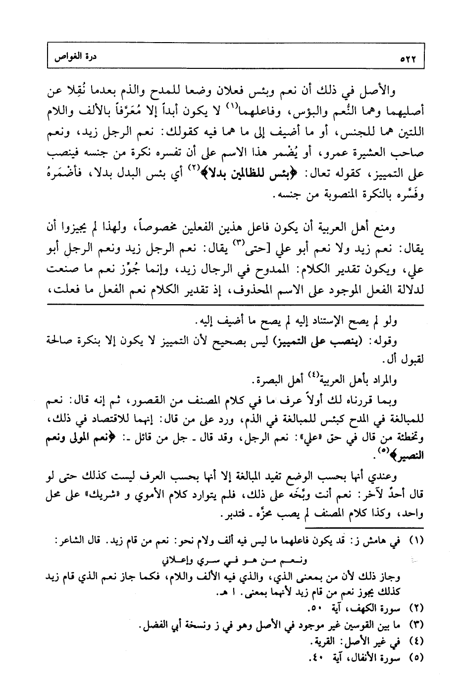 وبما قررناه لك أولاً عرف ما في كلام المصنف من القصور، ثم إنه قال: نعم للمبالغة في المدح كبئس للمبالغة في الذم، ورد على من قال: إنهما للاقتصاد في ذلك، وتخطئة من قال في حق "علي": نعم الرجل، وقد قال - جل من قائل -: {نعم المولى ونعم النصير}.
