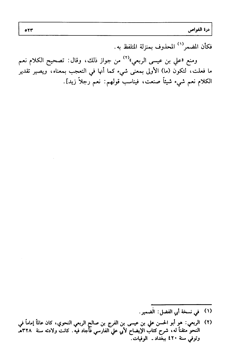 ومنع "علي بن عيسى الربعي" من جواز ذلك، وقال: تصحيح الكلام نعم ما فعلت، لتكون (ما) الأولى بمعنى شيء كما أنها في التعجب بمعناه، ويصير تقدير الكلام نعم شيء شيئًا صنعت، فيناسب قولهم: نعم رجلاً زيد].