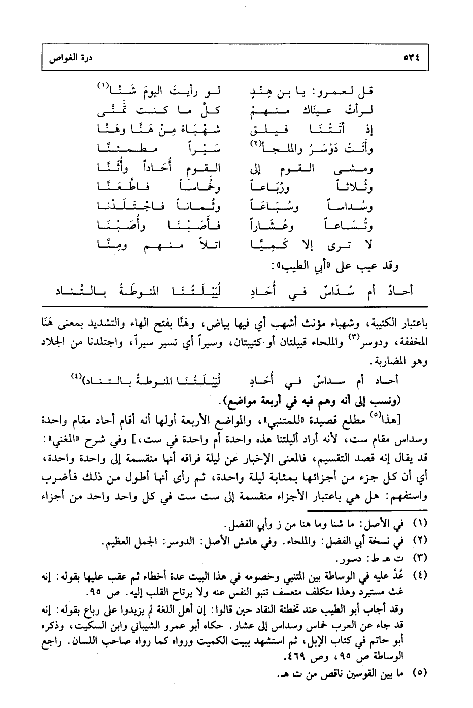 [هذا مطلع قصيدة "للمتنبي"، والمواضع الأربعة أولها أنه أقام أحاد مقام واحدة وسداس مقام ست، لأنه أراد أليلتنا هذه واحدة أم واحدة في ست، ] وفي شرح "المغني": قد يقال إنه قصد التقسيم، فالمعنى الإخبار عن ليلة فراقة أنها منقسمة إلى واحدة واحدة، أي أن كل جزء من أجزائها بمثابة ليلة واحدة، ثم رأى أنها أطول من ذلك فأضرب واستفهم: هل هي باعتابر الأجزاء منقسمة إلى ست ست في كل واحد واحد من أجزاء