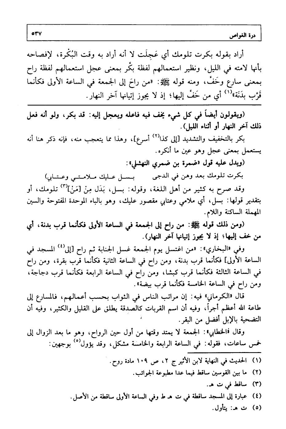 (ومن ذلك قوله صلى الله عليه وسلم: من راح إلى الجمعة في الساعة الأولى فكأنما قرب بدنة، أي من خف إليها؛ إذ لا يجوز إتيانها آخر النهار).