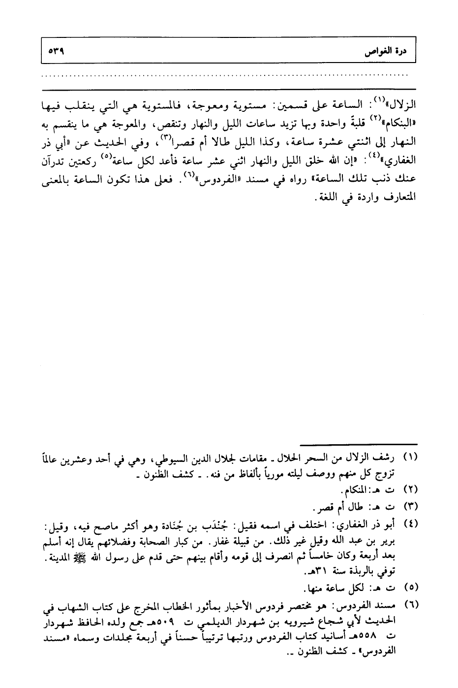 الزلال": الساعة على قسمين: مستوية ومعوجة، فالمستوية هي التي ينقلب فيها "البنكام" قبلة واحدة وبها تزيد ساعات الليل والنهار وتنقص، والمعوجة هي ما ينقسم به النهار إلى اثنتي عشرة ساعة، وكذا الليل طالا أم قصرا، وفي الحديث عن "أبي ذر الغفاري": "إن الله خلق الليل والنهار اثني عشر ساعة فأعد لكل ساعة ركعتين تدرآن عنك ذنب تلك الساعة" رواه في مسند "الفردوس". فعلى هذا تكون الساعة بالمعنى المتعارف واردة في اللغة.