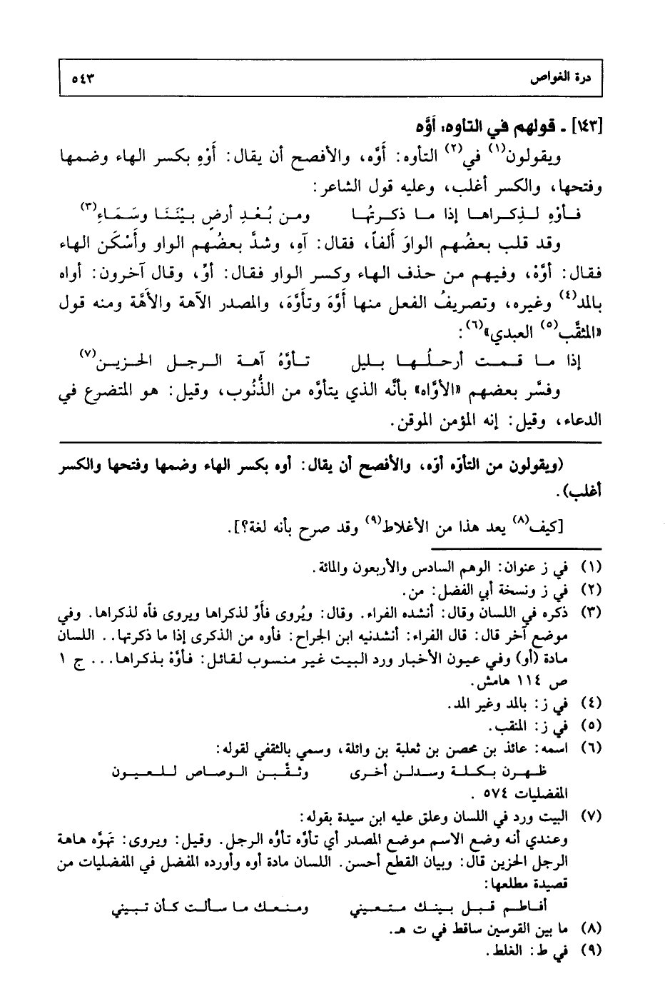 (ويقولون من التأوه أوه، والأفصح أن يقال: أوه بكسر الهاء وضمها وفتحها والكسر أغلب).
