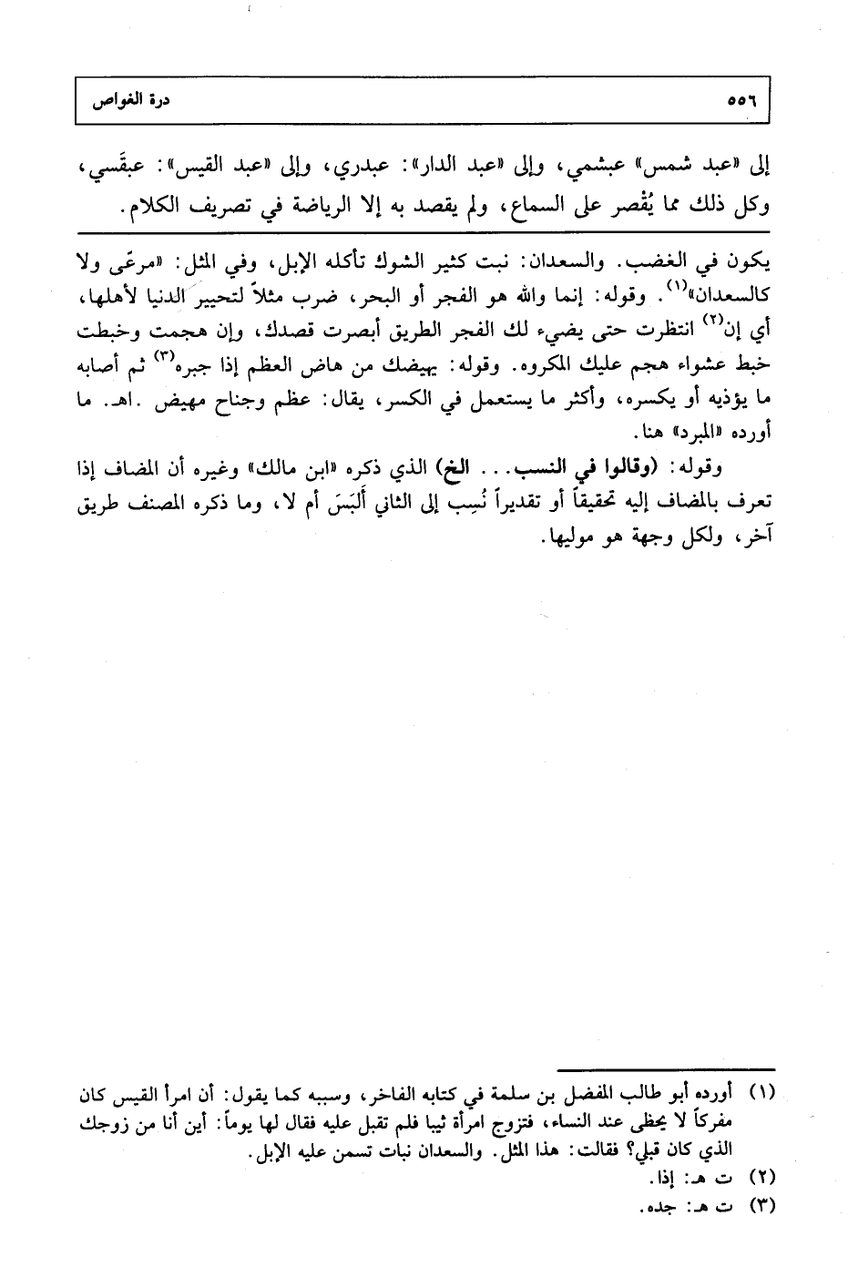 يكون في الغضب. والسعدان: نبت كثير الشوك تأكله الإبل، وفي المثل: "مرعى ولا كالسعدان". وقوله: إنما والله هو الفجر أو البحر، ضرب مثلاً لتحيير الدنيا لأهلها، أي إن انتظرت حتى يضيء لك الفجر الطريق أبصرت قصدك، وإن هجمت وخبطت خبط عشواء هجم عليك المكروه. وقوله: يهيضك من هاض العظم إذا جبره ثم أصابه ما يؤذيه أو يكسره، وأكثر ما يستعمل في الكسر، يقال: عظم وجناح مهيض. اهـ. ما أورده "المبرد" هنا.