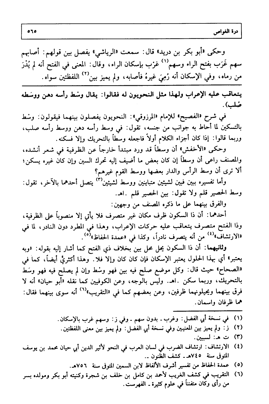 وحكى "أبو بكر بن دريد" قال: سمعت "الرياشي" يفصل بين قولهم: أصابهم سهم غرب بفتح الراء وسهم غرب بإسكان الراء، وقال: المعنى في الفتح أنه لم يذر من رماه، وفي الإسكان أنه رمي غيره فأصابه، ولم يميز بين اللفظتين سواه.