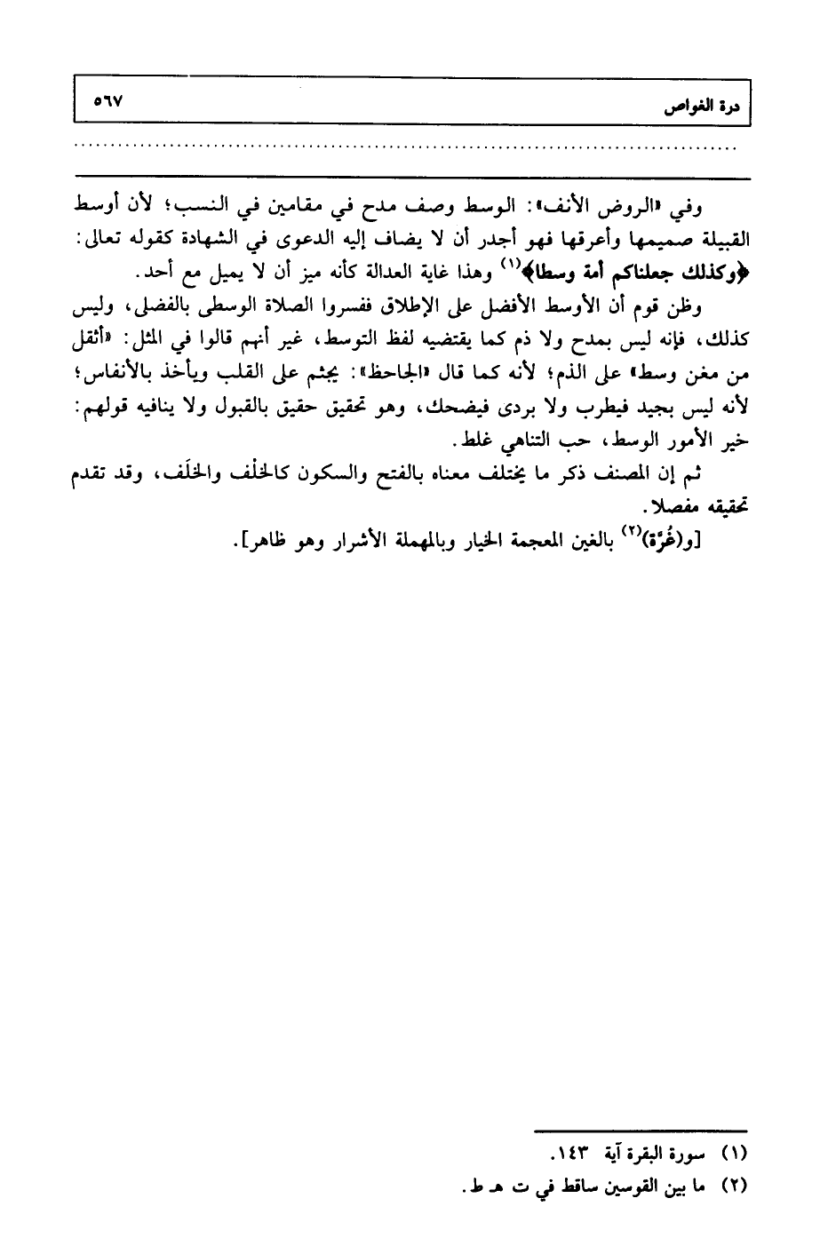 وفي "الروض الأنف": الوسط وصف مدح في مقامين في النسب؛ لأن أوسط القبيلة صميمها وأعرقها فهو أجدر أن لا يضاف إليه الدعوى في الشهادة كقوله تعالى: {وكذلك جعلناكم أمة وسطا} [البقرة: 143] وهذا غاية العدالة كأنه ميز أن لا يميل مع أحد.