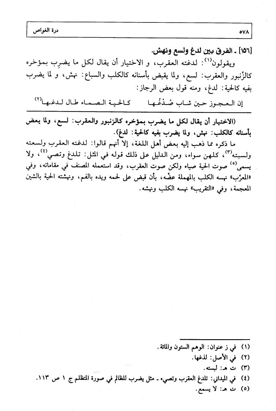 ما ذكره مما ذهب إليه بعض أهل اللغة، إلا أنهم قالوا: لدغته العقرب ولسعته ولسبته، كلهن سواء، ومن الدليل على ذلك قوله في المثل: تلدغ وتصي، ولا يسمى صوت الحية صياء ولكن صوت العقرب، وقد استعمله المصنف في مقاماته، وفي "المعرب" نهسه الكلب بالمهملة عضه، بأن قبض على لحمه ويده بالفم، ونهشته الحية بالشين المعجمة، وفي "التقريب" نهسه الكلب ونهشه.