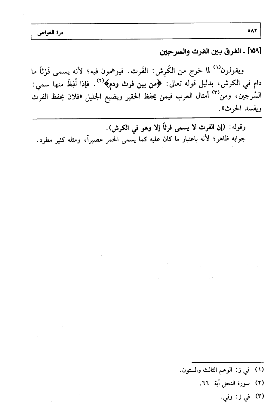 ويقولون لما خرج من الكرش: الفرث. فيوهمون فيه؛ لأنه يسمى فرثاً ما دام في الكرش، بدليل قوله تعالى: {من بين فرث ودم} [النحل: 66]. فإذا لفظ منها سمي: السرجين، ومن أمثال العرب فيمن يحفظ ويضيع الجليل "فلان يحفظ الفرث ويفسد الحرث".
