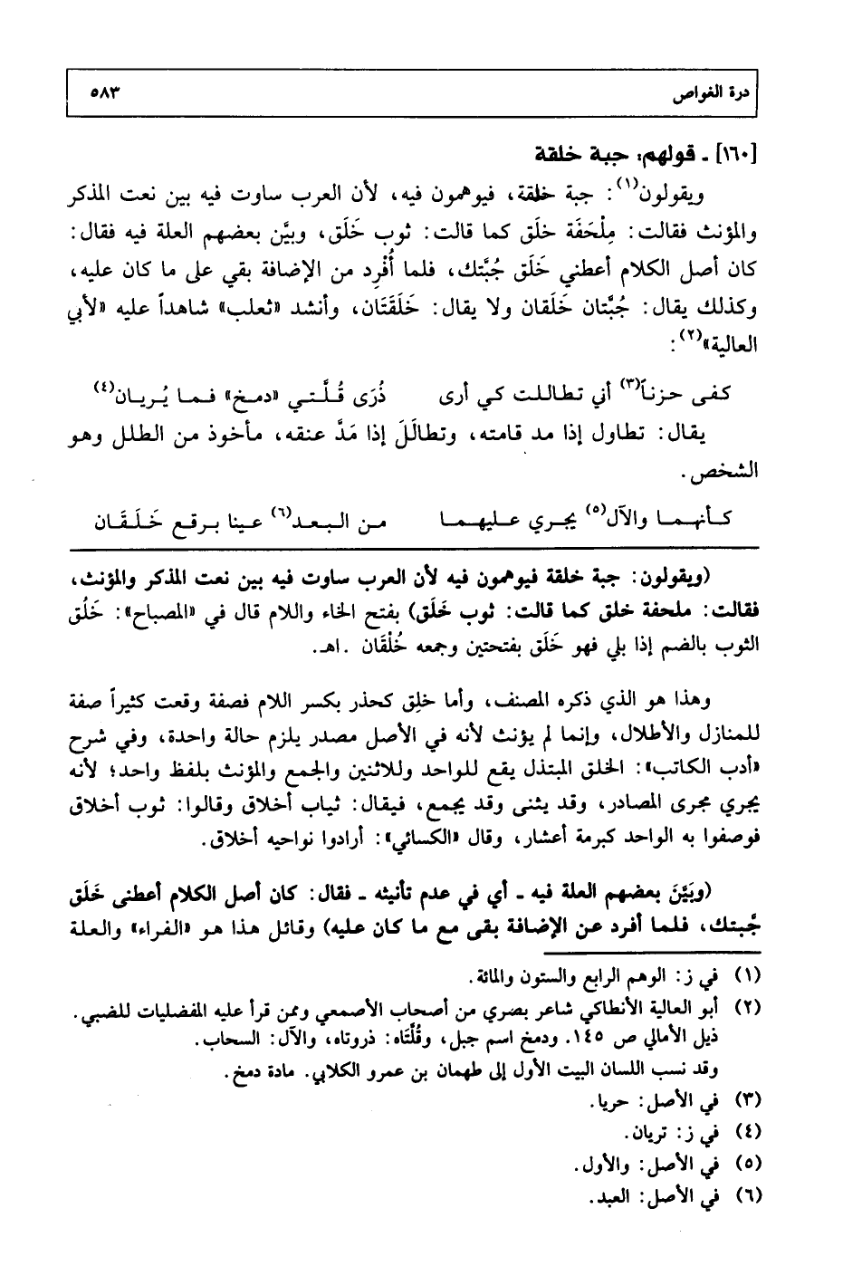 ويقولون: جبة خلقة، فيوهمون فيه، لأن العرب ساوت فيه بين نعت المذكر والمؤنث فقالت: ملحفة خلق كما قالت: ثوب خلق، وبين بعضهم العلة فيه فقال: كان أصل الكلام أعطني خلق جبتك، فلما أفرد من الإضافة بقي على ما كان عليه، وكذلك يقال: جبتان خلقان ولا يقال: خلقتان، وأنشد "ثعلب" شاهداً عليه "لأبي العالية":