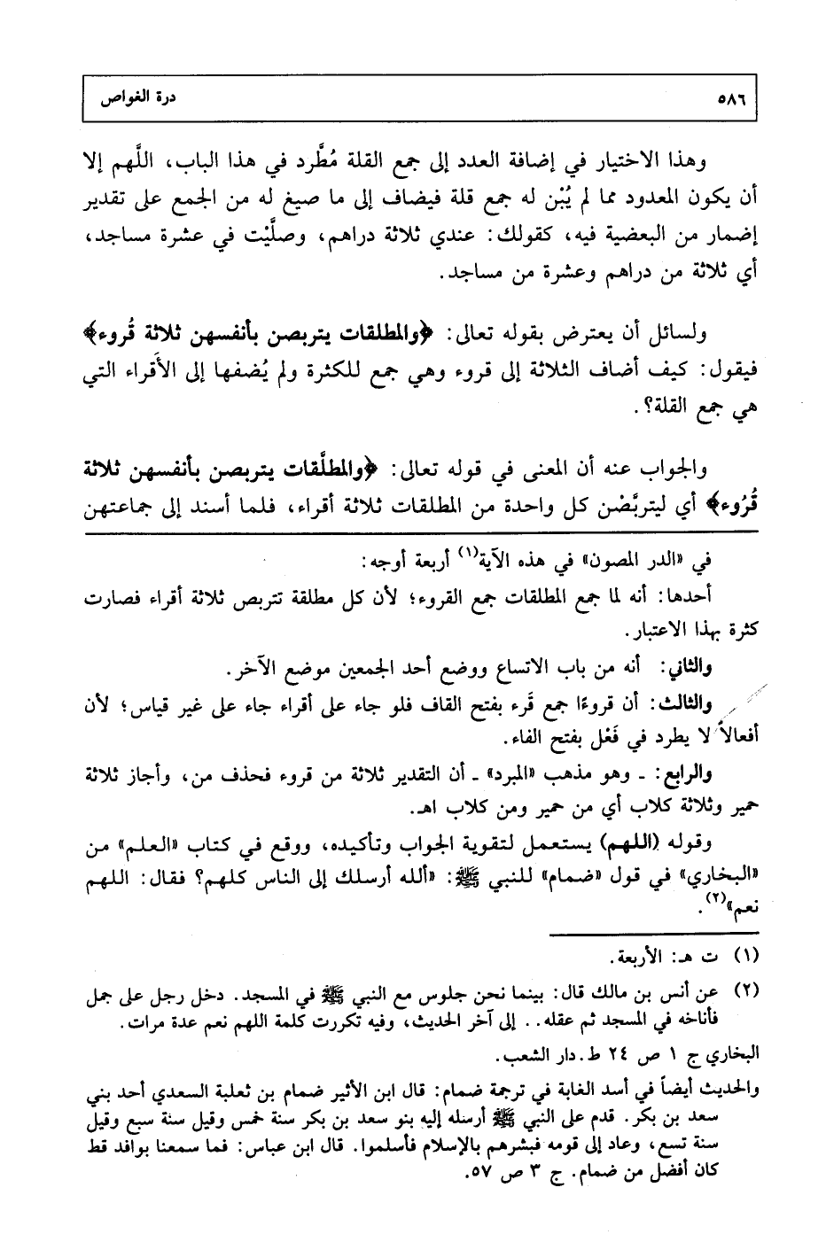 ولسائل أن يعترض بقوله تعالى: {والمطلقات يتربصن بأنفسهن ثلاثة قروء} فيقول: كيف أضاف الثلاثة إلى قروء وهي جمع للكثرة ولم يضفها إلى الأقراء التي هي جمع القلة؟ .
