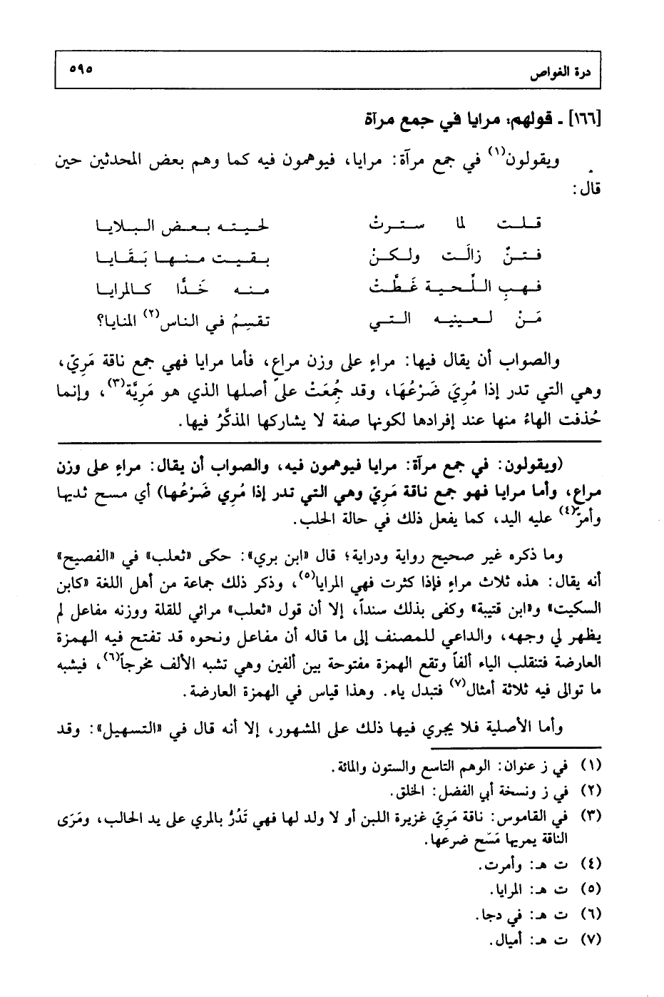 (ويقولون: في جمع مرآة: مرايا فيوهمون فيه، والصواب أن يقال: مراءٍ على وزن مراع، وأما مرايا فهو جمع ناقة مري وهي التي تدر إذا مري ضرعها) أي مسح ثديها وأمر عليه اليد، كما يفعل ذلك في حالة الحلب.