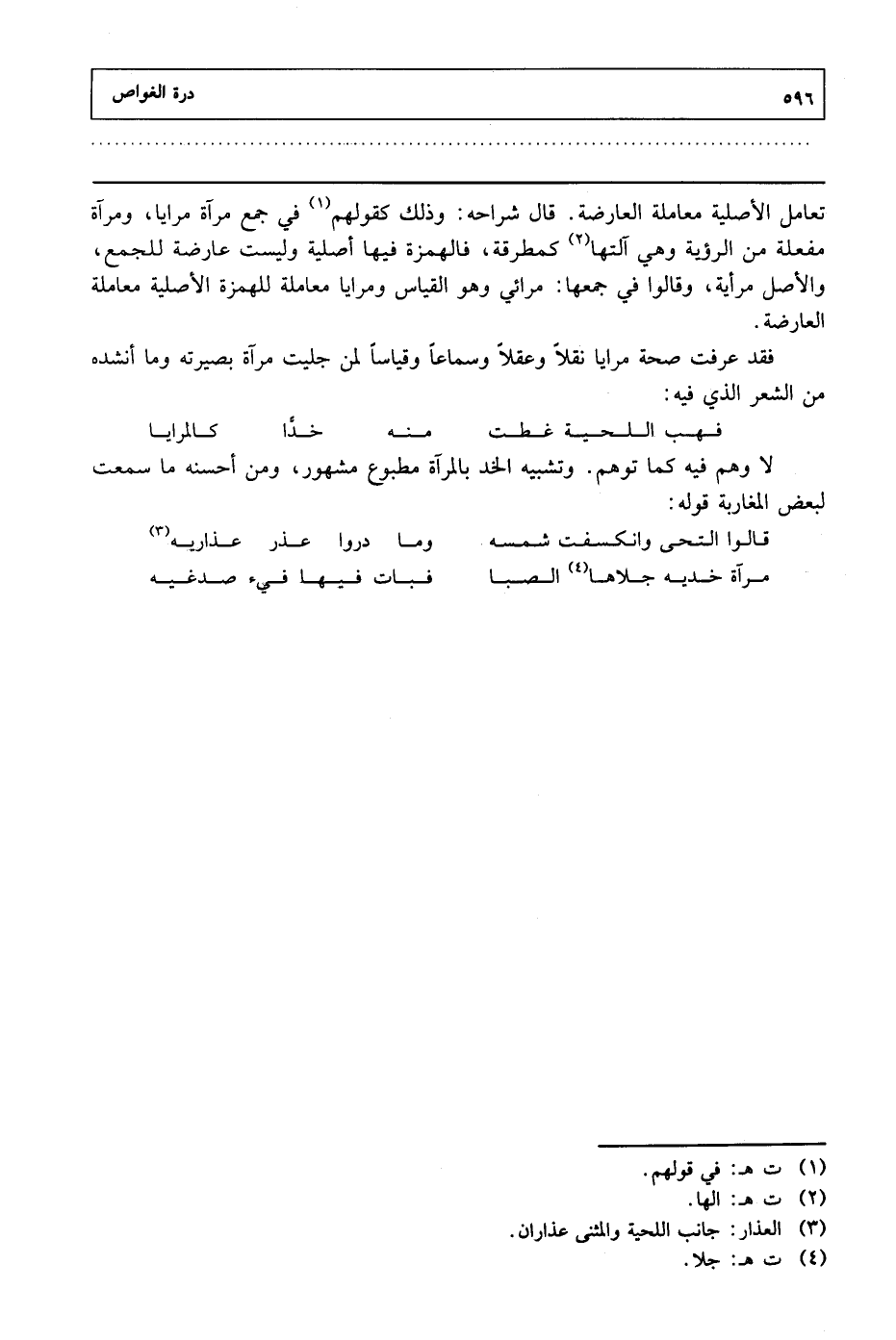 تعامل الأصلية معاملة العارضة. قال شراحه: وذلك كقولهم في جمع مرآة مرايا، ومرآة مفعلة من الرؤية وهي آلتها كمطرقة، فالهمزة فيها أصلية وليست عارضة للجمع، والأصل مرأية، وقالوا في جمعها: مرائي وهو القياس ومرايا معاملة للهمزة الأصلية معاملة العارضة.