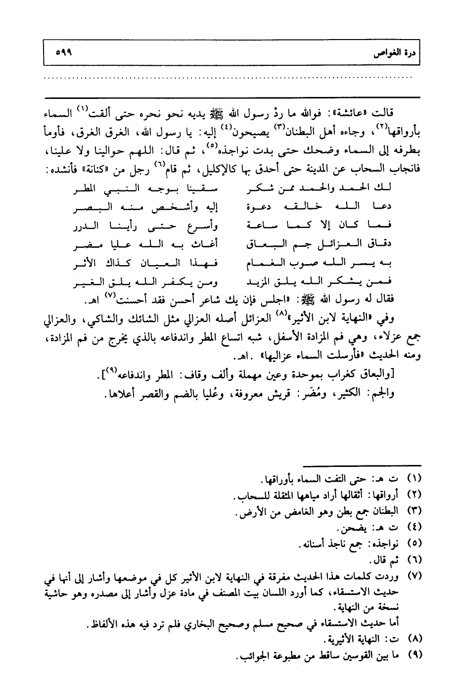 قالت "عائشة": فوالله ما رد رسول الله صلى الله عليه وسلم يديه نحو نحره حتى ألقت السماء بأرواقها، وجاءه أهل البطنان يصيحون إليه: يا رسول الله، الغرق الغرق، فأومأ بطرفه إلى السماء وضحك حتى بدت نواجذه، ثم قال: اللهم حوالينا ولا علينا، فانجاب السحاب عن المدينة حتى أحدق بها كالإكليل، ثم قام رجل من "كنانة" فأنشده: