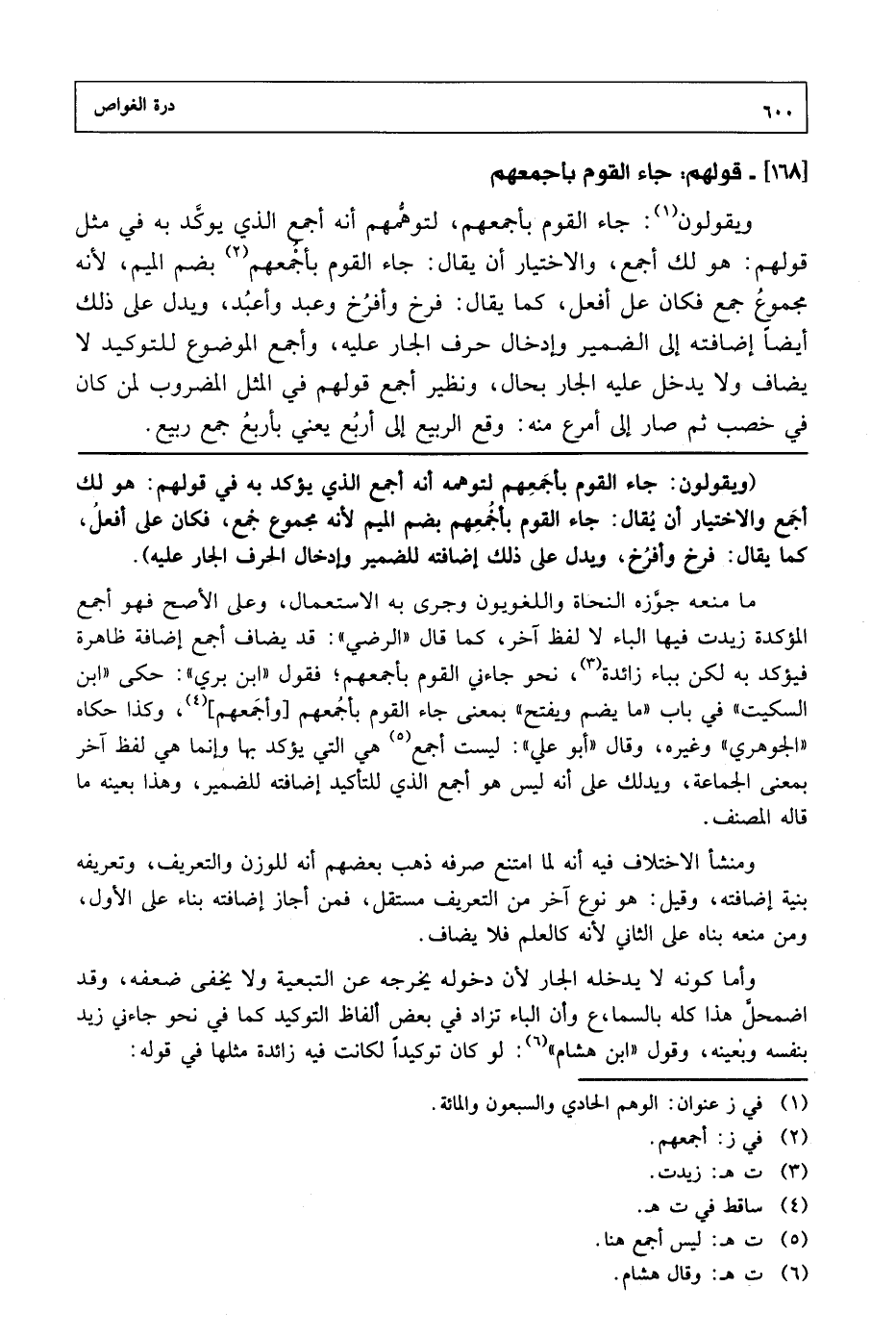 (ويقولون: جاء القوم بأجمعهم لتوهمه أنه أجمع الذي يؤكد به في قولهم: هو لك أجمع والاختيار أن يقال: جاء القوم بأجمعهم بضم الميم لأنه مجموع جمع، فكان على أفعل، كما يقال: فرخ وأفرخ، ويدل على ذلك إضافته للضمير وإدخال الحرف الجار عليه).