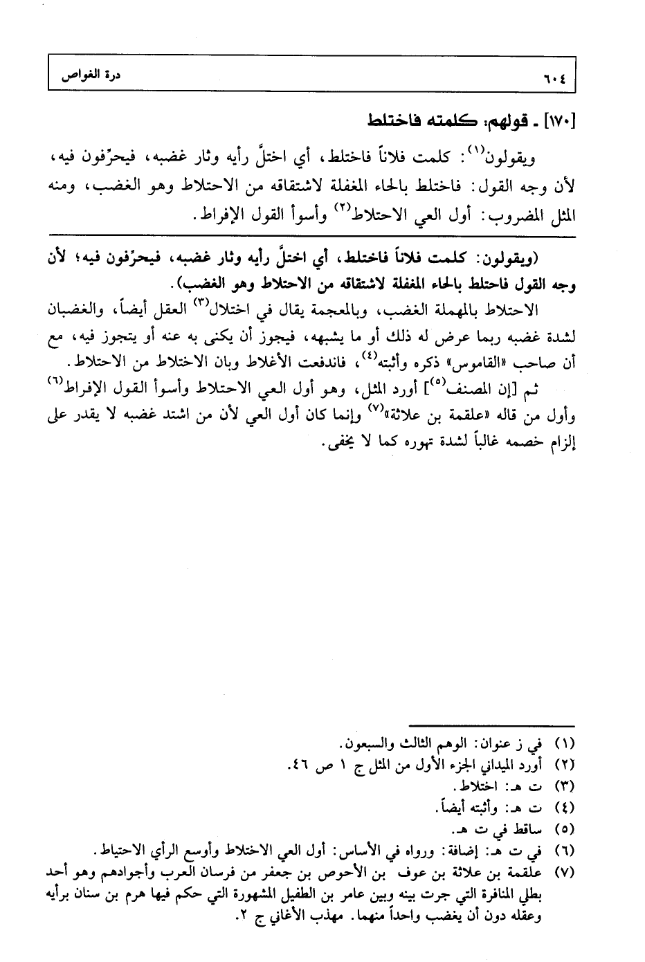(ويقولون: كلمت فلاناً فاختلط، أي اختل رأيه وثار غضبه، فيحرفون فيه؛ لأن وجه القول فاختلط بالحاء المغفلة لاشتقاقه من الاحتلاط وهو الغضب).