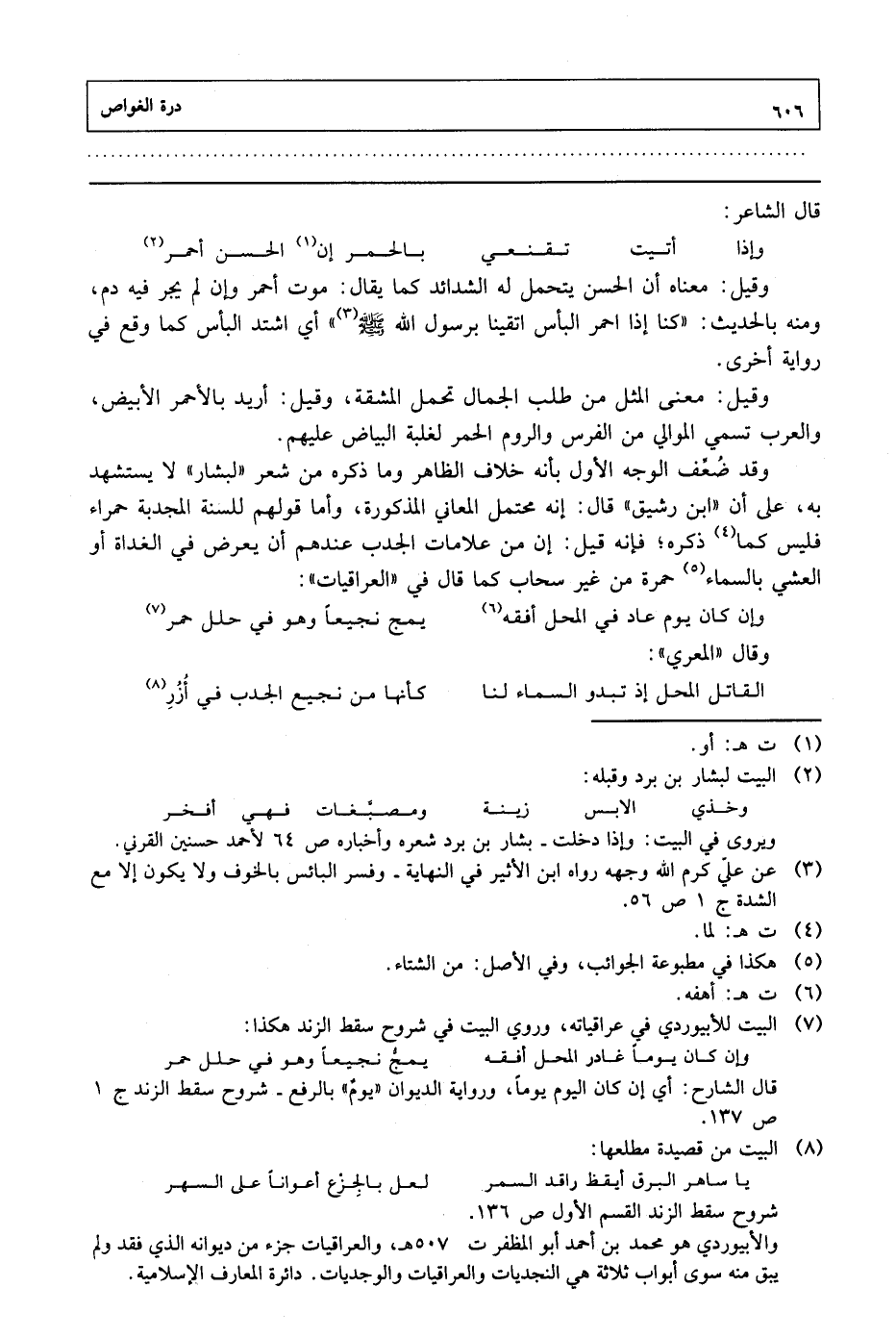وقيل: معنى المثل من طلب الجمال تحمل المشقة، وقيل: أريد بالأحمر الأبيض، والعرب تسمي الموالي من الفرس والروم الحمر لغلبة البياض عليهم.