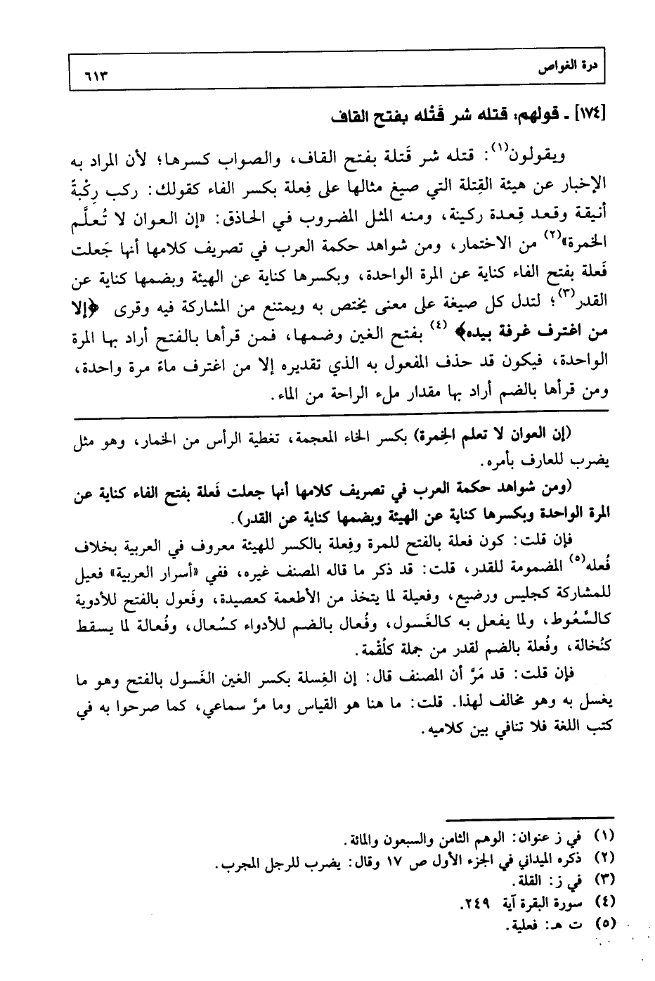 ويقولون: قتله شر قتلة بفتح القاف، والصواب كسرها؛ لأن المراد به الإخبار عن هيئة القتلة التي صيغ مثالها على فعلة بكسر الفاء كقولك: ركب ركبة أنيقة وقعد قعده ركينة، ومنه المثل المضروب في الحاذق: "إن العوان لا تعلم الخمرة" من الاختمار، ومن شواهد حكمة العرب في تصريف كلامها أنها جعلت فعلة بفتح الفاء كناية عن المرة الواحدة، وبكسرها كناية عن الهيئة وبضمها كناية عن القدر؛ لتدل كل صيغة على معنى يختص به ويمتنع من المشاركة فيه وقرى {إلا من اغترف غرفة بيده} [البقرة: 249] بفتح الغين وضمها، فمن قرأها بالفتح أراد بها المرة الواحدة، فيكون قد حذف المفعول به الذي تقديره إلا من اغترف ماء مرة واحدة، ومن قرأها بالضم أراد بها مقدار ملء الراحة من الماء.