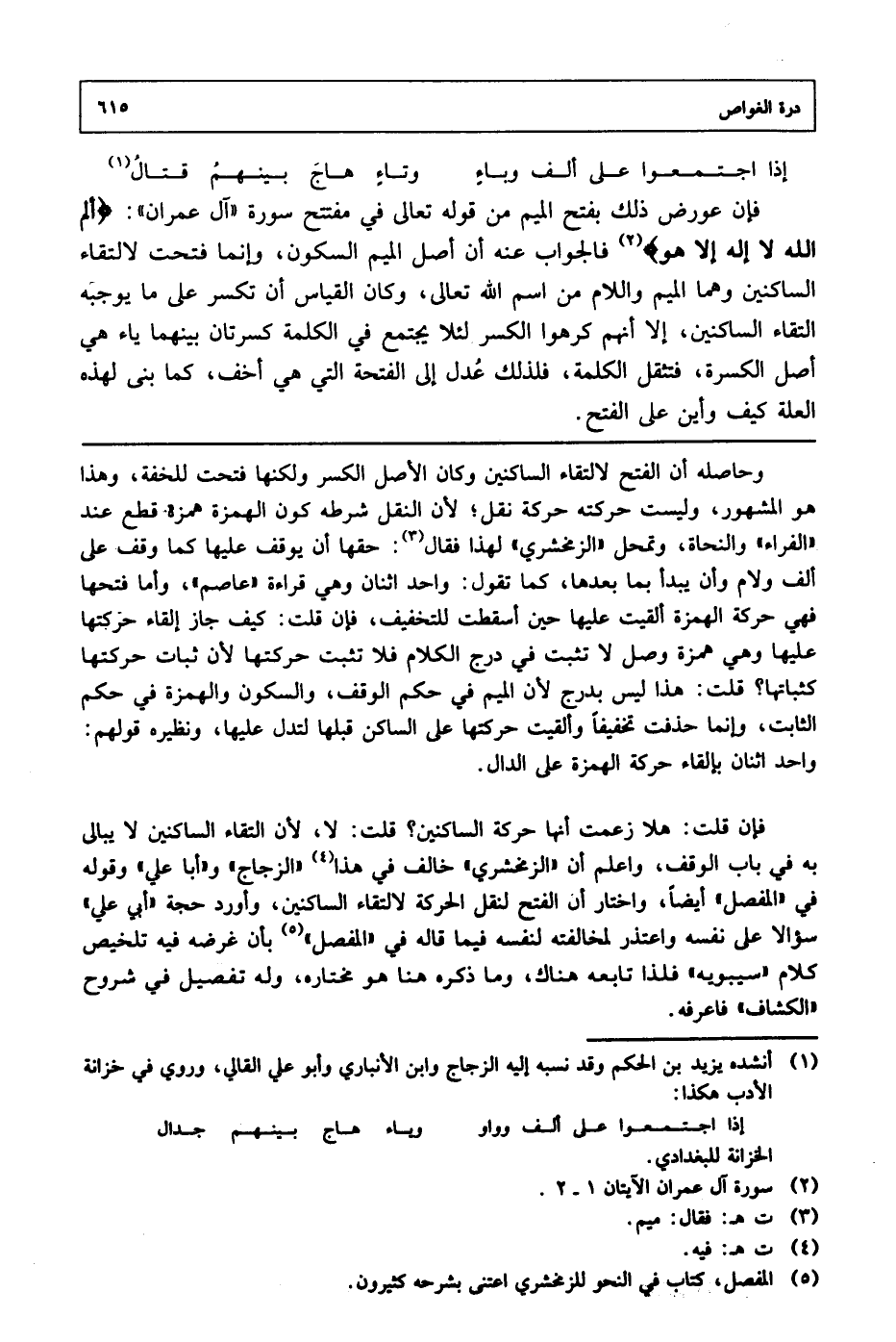 فإن عورض ذلك بفتح الميم من قوله تعالى في مفتتح سورة "آل عمران": {ألم الله لا إله إلا هو} فالجواب عنه أصل الميم السكون، وإنما فتحت لالتقاء الساكنين وهما الميم واللام من اسم الله تعالى، وكان القياس أن تكسر على ما يوجبه التقاء الساكنين، إلا أنهم كرهوا الكسر لئلا يجتمع في الكلمة كسرتان بينهما ياء هي أصل الكسرة، فتثقل الكلمة، فلذلك عدل إلى الفتحة التي هي أخف، كما بنى لهذه العلة كيف وأين على الفتح.