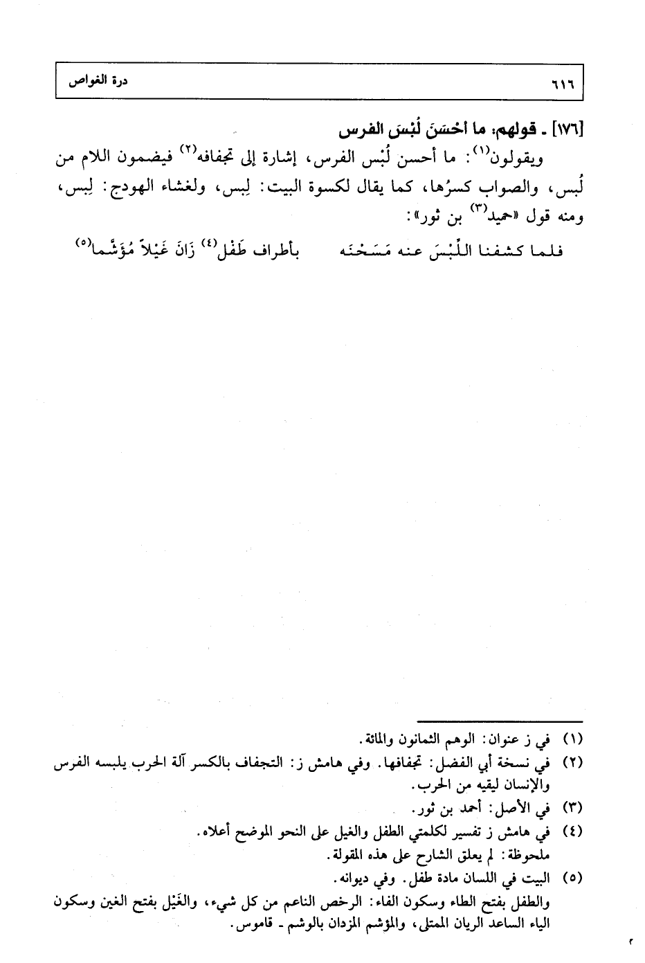 ويقولون: ما أحسن لبس الفرس، إشارة إلى تجفافه فيضمون اللام من لبس، والصواب كسرها، كما يقال لكسوة البيت: لبس، ولغشاء الهودج: لبس، ومنه قول "حميد بن ثور":